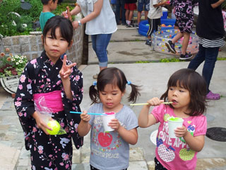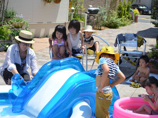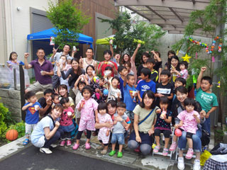 今回、夏祭りの企画をされたのは、有志の奥様方。回覧用のチラシや、当日の引換えチケット等も全て手作り。食材の手配や子供たちが楽しめるゲームの準備等も、ご近所の皆さんにお声掛けし、分担しながら準備されたそうです。当日は、テントや機材もご入居者の皆さんで持ち寄られ、お父さん方も大活躍でした。ご近所の幼稚園で分けていただいた笹に七夕飾りをさげる姿も。暑い中、子供たちのために笑顔でお祭りをされる皆さんの姿と、とっても楽しそうにかき氷をほおばる子供たちの姿が印象的でした。