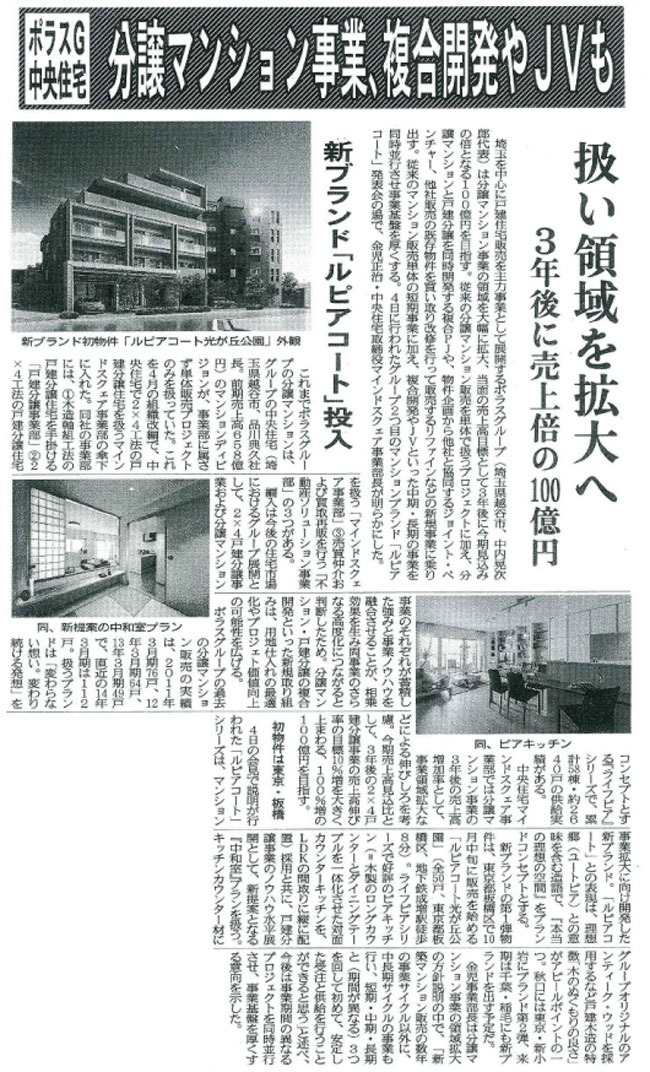 ㈱中央住宅では、分譲マンション事業の領域を大幅に拡大し、当面の売上高目標として3年後に今期見込みの倍となる100億円を目指します。従来の分譲マンション販売を単体で扱うプロジェクトに加え、分譲マンションと戸建分譲を同時開発する複合プロジェクトや、物件企画から他社と協同するジョイント・ベンチャー、他社販売の既存物件を買い取り改修を行って販売するリファイン等の新規事業に乗り出します。そこで今回、新マンションブランド「ルピアコート」が東京都板橋区で10月中旬より販売を開始します。