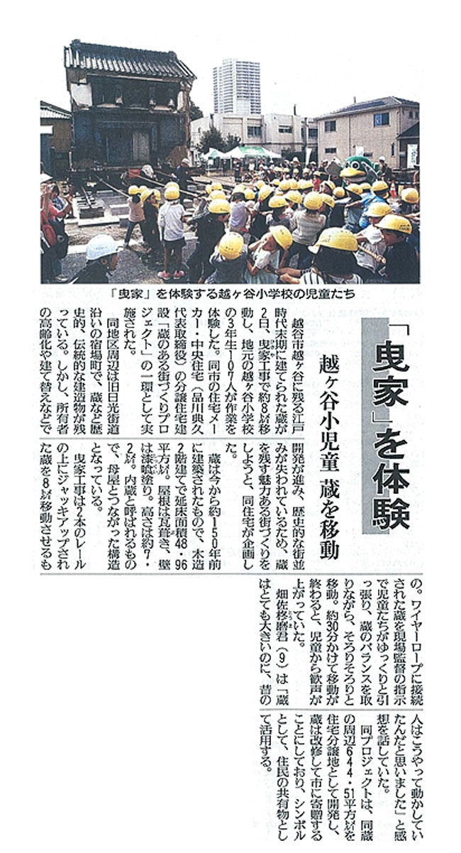 ㈱中央住宅の分譲住宅建設「越ヶ谷 蔵のある街づくりプロジェクト」の一環として、地元の越ヶ谷小学校3年生107人が「曳家」を体験した記事が掲載されました。