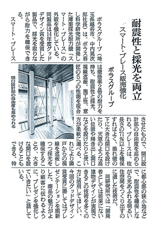 ポラス暮し科学研究所が開発した薄型採光体力壁「スマート・ブレース」は、耐震性・採光性・視線遮蔽性・施工性・意匠性の相互補完による、「自由度の高い開口部設計」と「明るく開放的な住空間」を実現させた製品です。空間の壁面、四辺全てをハイサイドライト化できるため、隣地からの視線を遮りつつ十分な自然光が得られます。また、シャープさを追求したプレースフォルムにより、構造を空間側に露出させるデザインになっています。仕上げ材の上から施工可能なため、耐震補強リフォームも簡易に行えます。
