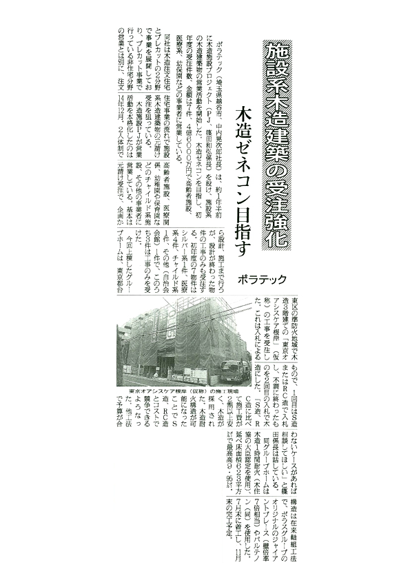 ポラテック㈱は昨年より木造施設プロジェクトを設け、木造非住宅建築物の営業活動を本格化しています。主に高齢者や医療、チャイルド系施設等における設計・施工を手掛けており、「東京オアシスケア根岸」(仮称)のグループホームは11月末竣工予定で進めています。