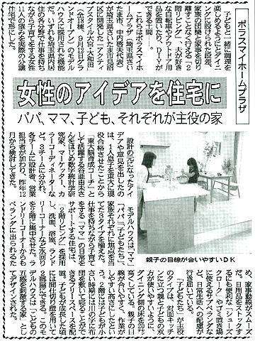 ポラスマイホームプラザ㈱が、埼玉県内居住の各分野で仕事を持ちながら子育てをする女性のアイデアを実際の分譲地「アクティブスタイル大宮・大和田」(全18棟)に取り入れました。「パパ」「ママ」「子ども」を意識したプランづくりをポラスの設計担当者と進め、9月12日にモデルハウスがグランドオープンしています。
