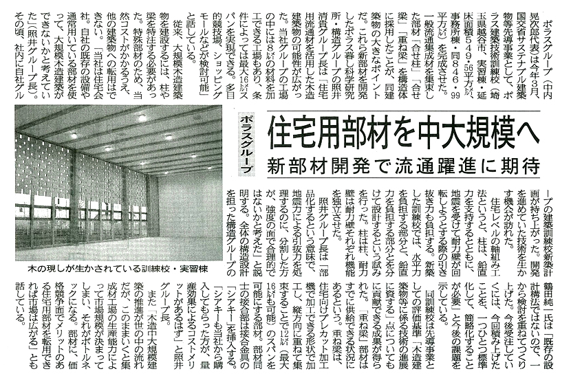 ポラス暮し科学研究所が開発した、一般流通集成材を複数本集束し、木造住宅以外の木造大型建築物の柱や梁にコストを抑えて活用できる「合せ柱・合せ梁・重ね梁」を採用していることや、平成27年度サステナブル建築物等先導事業(木造先導型)のプロジェクトに採択されたことでも注目をされています。