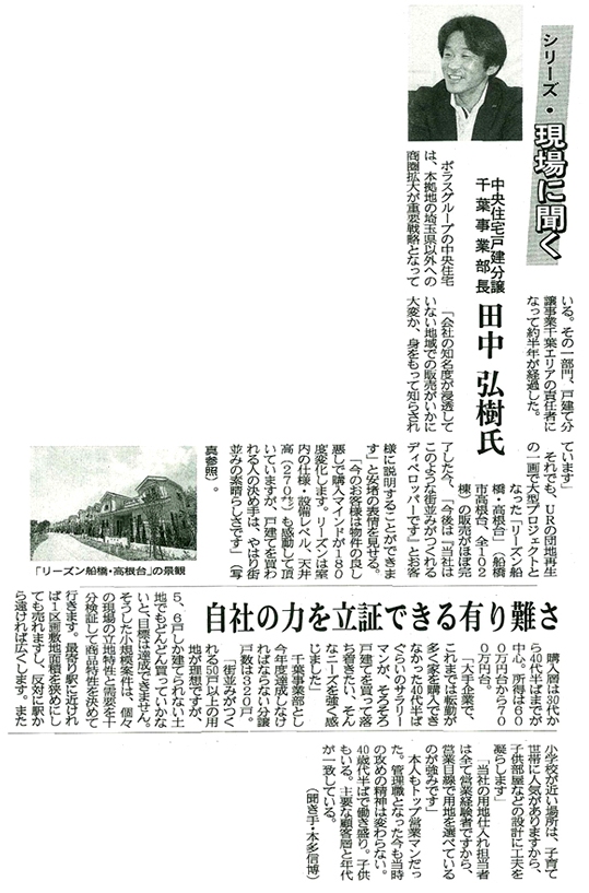 大型分譲地『リーズン船橋・高根台』(全102棟)の販売がほぼ完売できた経験を生かし、今後の街並み作りや事業発展等について語っている記事が紹介されています。