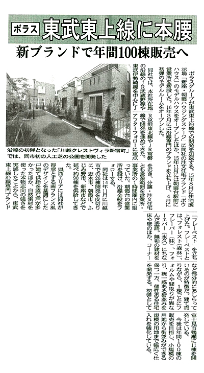 東武東上線沿線で初弾となった『 川越クレストヴィラ新宿町 』や、今後は東武東上線専門新ブランド「フレーベスト」で年間100棟販売を目指し、小規模の用地から街並みができる規模の用地まで幅広く仕入れを強化していくことが紹介されています。