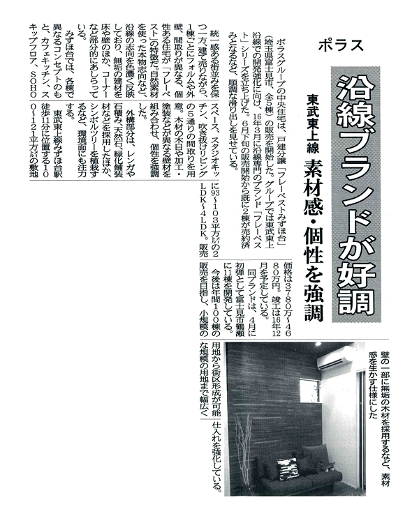 ポラスグループの㈱中央住宅(戸建分譲第一事業部)が手掛ける『フレーベストみずほ台』(富士見市全5棟)は、6月下旬より販売を開始しております。同グループが東武東上沿線での開発強化に向けて、今年3月に新ブランド「フレーベスト」を立ち上げてから順調に販売をしている記事が掲載になりました。