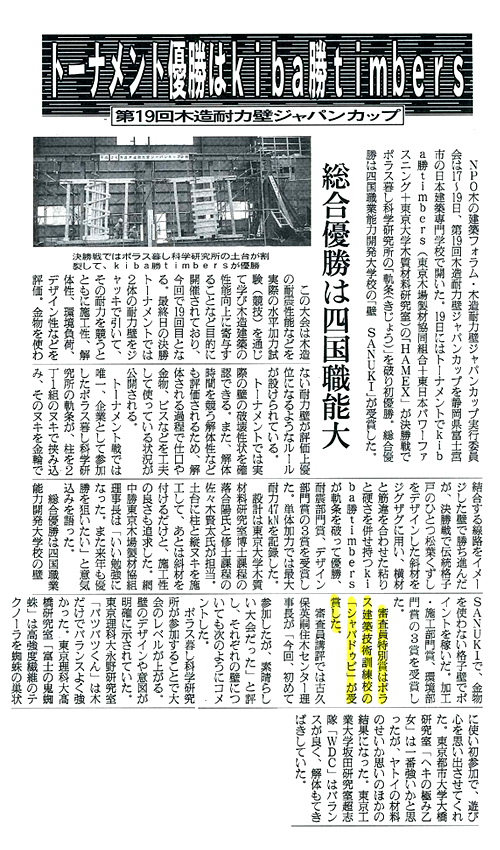 静岡県富士宮市で行われた【第19回木造耐力壁ジャパンカップ】で、ポラスグループ・ ㈱ポラス暮し科学研究所の「軌条 (きじょう)」は決勝戦まで勝ち残り、またポラス建築技術訓練校の「シャバドゥビ」が『審査員特別賞』を受賞しました。