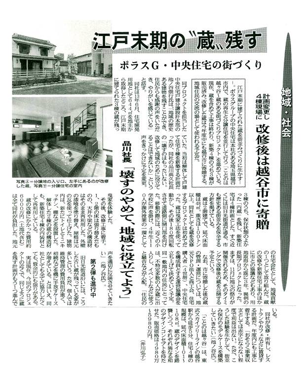【 ことのは越ヶ谷 】 江戸時代末期に建てられた蔵と新築4邸からなる分譲地です。再生した蔵とともに、『坪庭のある家』 『縁側のある家』 『茶室のある家』 『土間のある家』 と一邸ごとに和のコンセプトを持たせ、室内には蔵で使用されていた古材を内装材等として再利用するなど、蔵と融合し趣きのある街並みとなっております。 |