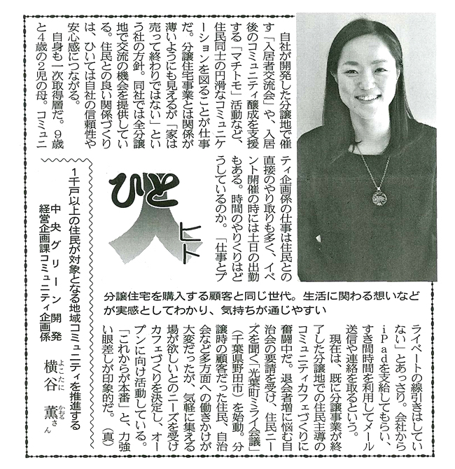 自社が開発した分譲地で催す「入居者交流会」や、入居後のコミュニティ醸成を支援する「マチトモ」活動など、住民同士の円滑なコミュニケーションを図ることが仕事となります。住民との交流、関係づくりや仕事とプライベートの時間のやりくり、今後の意気込みなどを語っています。また、七光台で行っている住民参加型のカフェづくりを通じてコミュニティの醸成に取り組んでいることも紹介しています。