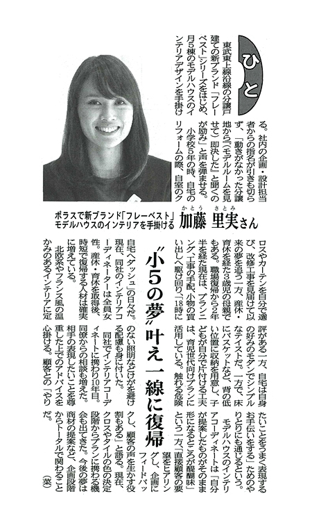 弊グループ「株式会社住宅資材センター」インテリア部 加藤 里実は、東武東上線エリアを中心に展開しているポラスの分譲住宅・新ブランド『フレーベスト』シリーズを始め、月5棟のモデルハウスのインテリアデザインを手掛けています。小学5年生からの夢である、インテリアコーディネートを担当し10年目。今後は商材の提案など、企画段階からトータルで関わりたいと語っています。