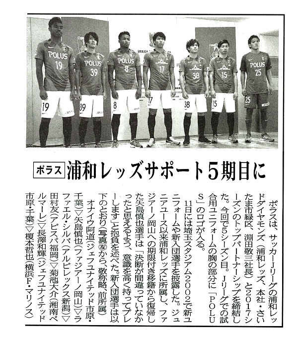 浦和レッズのユニフォームの胸の部分には、ポラスグループのロゴである『 POLUS 』が入り、2017シーズンのJリーグ、YBCルヴァンカップ、天皇杯、ゼロックススーパーカップ等の大会において着用されます。