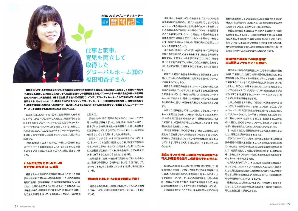 ポラスグループ・代表 中内晃次郎が副会長を務める、「日本木造住宅産業協会」発行の季刊誌『木芽』に、グローバルホーム株式会社 福田和香子の記事が掲載されました。