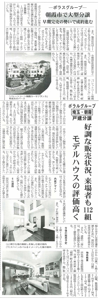 『パレットコート朝霞 カーサブランカ』(全64棟)は、東武東上線沿線でグループ史上最大規模の戸建分譲プロジェクトとなります。2017年1月14日より販売を開始し、現在まで1期・2期と合わせて30棟中23棟をご契約いただいており、順調に販売が進んでおります。