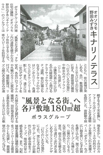 中央住宅では「キナリノテラス(60棟)」の販売を開始しています。”風景となる街”をコンセプトに美しい街並を表現するための様々な工夫が紹介されています。