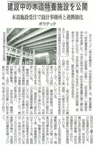 この施設はポラテックが手掛ける非住宅木造物件では最大規模の「特別養護老人ホーム別邸暁(仮称)」で、地面積8,017.43平米、述べ床面積は4,552.09平米(1,374.25坪)ユニット型100床、入居スペースは約12平米となっており、工期は2017年の12月25日予定です。