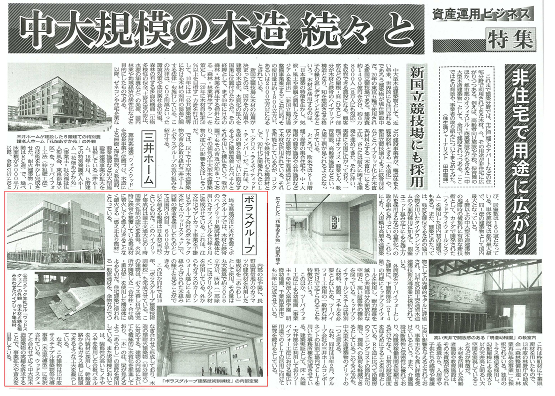 1つ目は、2012年に完成したポラテックの本社ビル「ウッドスクェア」。木材と鉄骨のハイブリッド集成材を躯体に用いたオフィスビルで国土交通大臣の一時間耐火性能の認定を取得しています。