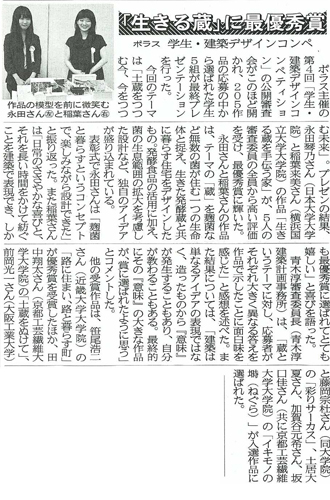 6月23日にポラスグループが主催する「第4回 POLUS-ポラス- 学生・建築デザインコンペティション」の公開審査会について掲載されました。 第4回のテーマは『土蔵をつつむ今、今をつつむ未来』で、応募総数205作品の中から5組がプレゼンテーションを行い、最優秀賞を受賞したのは5人の審査委員の全員から高い評価を受けた、横浜国立大学大学院と日本大学大学院の女性ペアでした。