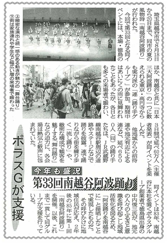 8月18~20日までの3日間で行われた「第33回南越谷阿波踊り」の記事が掲載されました。 あいにくの雨に見舞われましたが、各日とも多くの来客者で賑わい、述べ60万人の方が来場し「南越谷阿波踊り」を楽しみました。