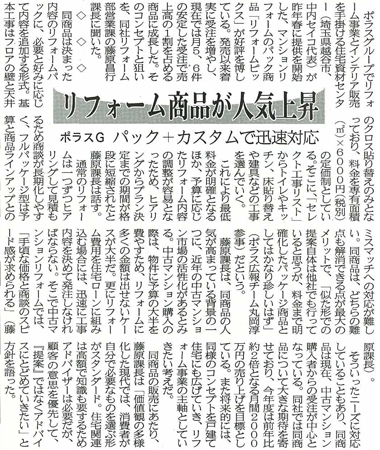 『リフォームピックス』は発売以来着実に受注を増やしており、今後も更にお客様からのニーズが高まる商品と紹介されています。また、記事の中では、住宅資材センターリフォーム部営業課 課長 藤原 昌行のインタビューも紹介されています。