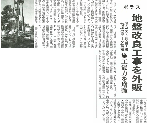ポラスグループが今まで施工した累計4万棟の地盤改良工事の実績とノウハウを活かして、供給エリアを中心に外部受注を開始することや、ポラスオリジナルのSF-Raft工法についても紹介されています。