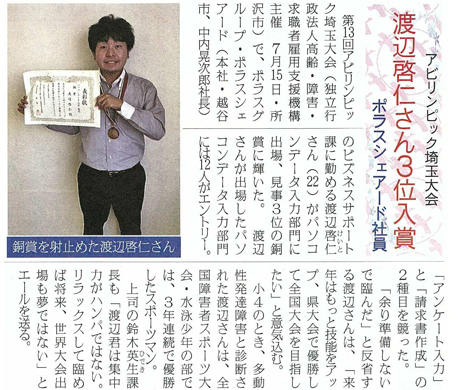 ポラスグループのポラスシェアード ビジネスサポート課に所属する渡辺が第13回アビリンピック埼玉大会に出場しました。『パソコンデータ入力部門』には12名がエントリーし、「アンケート入力」や「請求書作成」の2種目で競い、見事3位に入賞しました。 記事では、大会を終えてのコメントや2018年の大会に向けての意気込み等も紹介されています。