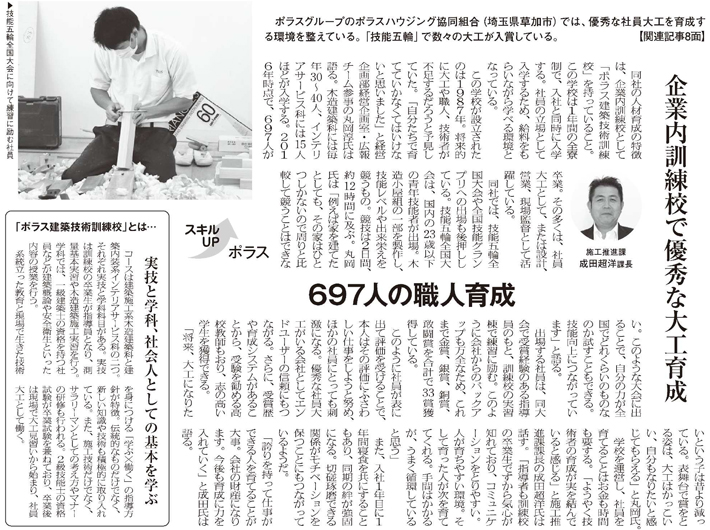 ポラス建築技術訓練校は将来的に大工や職人、技術者が不足すると考え、会社の財産となる人材を育成するために設立されたことや「技能五輪全国大会」「技能グランプリ」で数多くの受賞者を輩出していることが紹介されています。