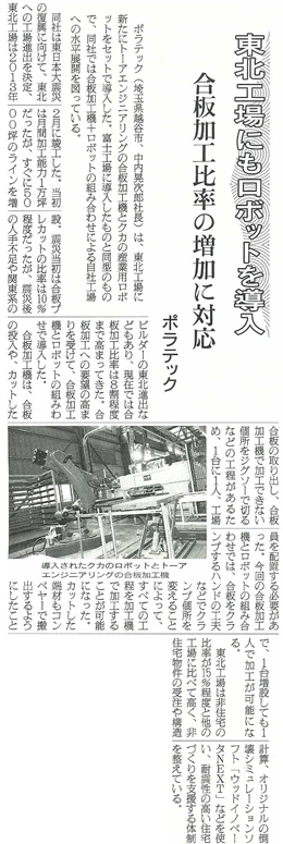ポラテックの東北工場が新たに産業用ロボットを導入した記事が掲載されました。 東日本大震災の復興に向けて2013年に竣工した東北工場。今回、同工場では合板加工の需要増加を受けて、合板加工機と併せて産業用ロボットを導入しました。産業用ロボットを導入したことで、少ない人員でも合板加工が可能となったこと等が紹介されています。
