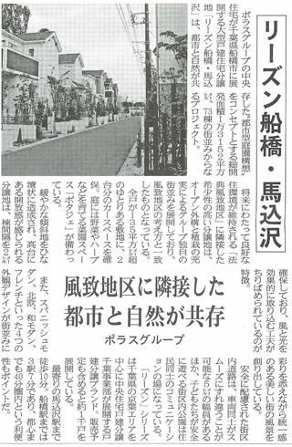 住宅産業新聞の「まちづくり特集」各社の取り組みにおいて、戸建分譲千葉事業部が手掛ける『リーズン船橋・馬込沢プレシャスガーデン(全73戸)』の記事が掲載されました。