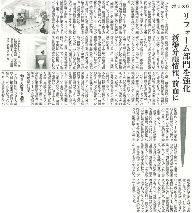 住宅資材センターリフォーム部 部長 増田 浩之のリフォーム部門の強化やショールームの展開について等のコメントも紹介されています。