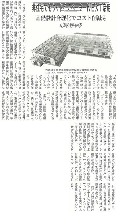 ポラス暮し科学研究所が開発した構造計算ソフト「ウッド・イノベーターNEXT」を使用することでコスト削減等が可能なことから、非住宅のプレカット営業で木造提案を更に進めていくと紹介されています。