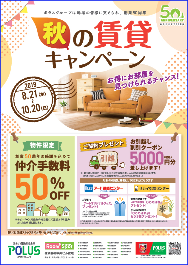 ポラスグループ創業50周年の感謝を込めて、物件限定!『仲介手数料50%OFF』でお引越しをサポート!
