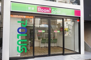 「ルームスポット」のピンクと緑のロゴマークの看板が目印、入口ガラス張りの明るいお店です。