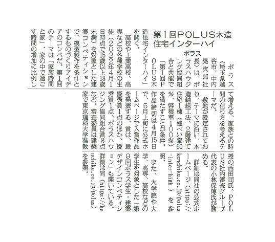 ※掲載記事をクリックすると拡大します 日刊木材新聞 2022年3月30日掲載
