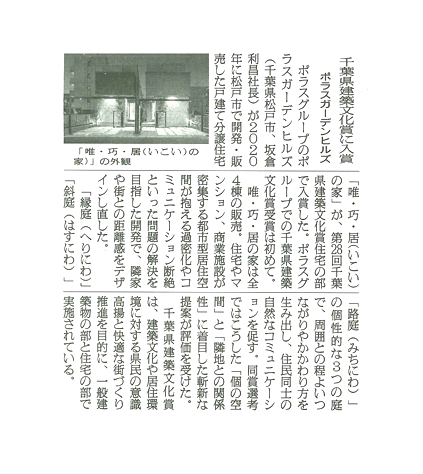 ◆『第28回令和3年度)千葉県建築文化賞入賞「唯・巧・居(いこい)の家(全4棟)」』のニュースリリースはこちらをご覧ください
