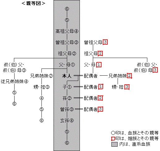 この要件における親族とは「6親等以内の血族若しくは3親等以内の姻族」をいいます。(詳しくは以下の親等図の通りとなります)