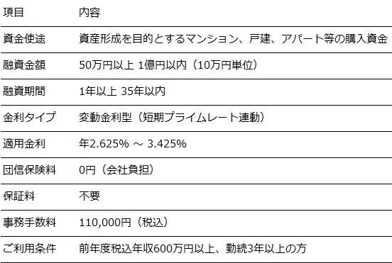 まずは資金計画です。「融資条件がわからない」「審査が厳しい」というイメージをお持ちではありませんか?ポラスグループと提携している協同住宅ローン株式会社の「資産形成ローン」は、これから資産形成を始める会社員の方にも使いやすい好条件が揃っています。
