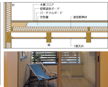 中間階の厚床張り合板の上に、吸音材としてのグラスウールと空気層を設けて遮音性を高めた床。空気層部分は配管・配線スペースとしても活用できる。また、バルコニー出入りのためのまたぎを無くし、フラットな出入りを可能とする。 |