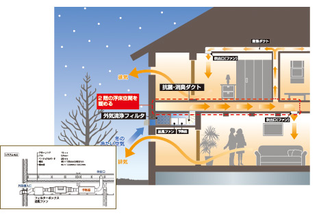 中間階2重床【快床】の空気層をチャンバーとして、外気を導入、温水予熱装置を通して予熱した新鮮空気を各室に搬送し、全館を15℃以上に保つ。また、中間階床は床暖房効果を生み、1階床暖房と併用することで、全館温度差の無い、朝方でも15℃を下回らない快適な環境が実現できる。 |