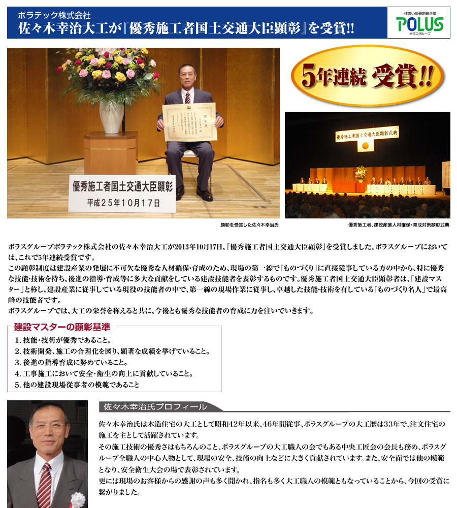 ポラスグループ ポラテック株式会社の佐々木幸治大工が2013年10月17日、『優秀施工者国土交通大臣顕彰』を受賞しました。ポラスグループにおいては、これで5年連続受賞です。この顕彰制度は建設産業の発展に不可欠な優秀な人材確保・育成のため、現場の第一線で「ものづくり」に直接従事している方の中から、特に優秀な技能・技術を持ち、後進の指導・育成等に多大な貢献をしている建設技能者を表彰するものです。ポラスグループでは、大工の栄誉を称えると共に、今後とも優秀な技能者の育成に力を注いでいきます。
