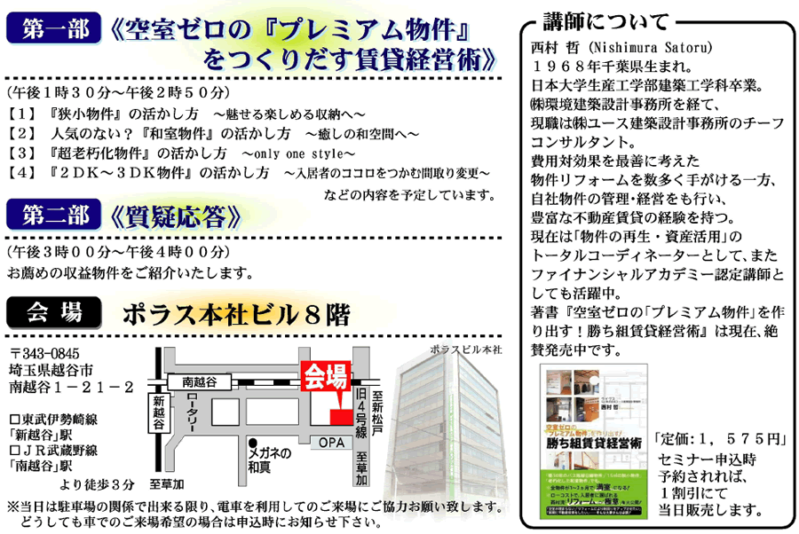 目からウロコのローコスト アパート・マンション変身術 開催日時 平成21年6月21日(日) 受付開始: 午後1時00分〜