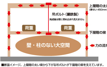 上層階の梁が下層階の梁を吊ることで、梁を支える柱を無くし、開放的な空間を創ることができる。