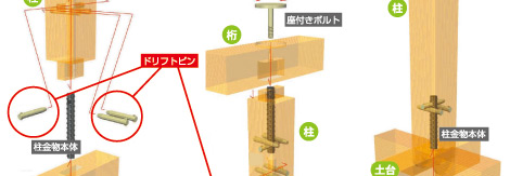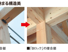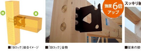 一般的な仕口接合と比べ接合強度が最大6倍にアップする。組み立て終わると梁の中に隠れるので、柱や梁をあらわしたインテリアも美しく演出できる。