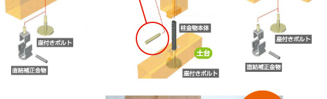 土台と柱の新しい接合方法「Pロック」は、ドリフトピンがクロスするように打ち込むことで力を分散。従来の金物と同等以上の強度を誇るとともに、柱の中心で接合することにより、全方向からの力に対して安定した強度を発揮する。