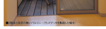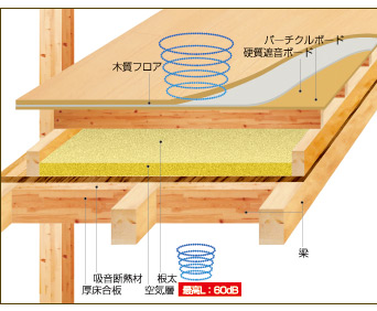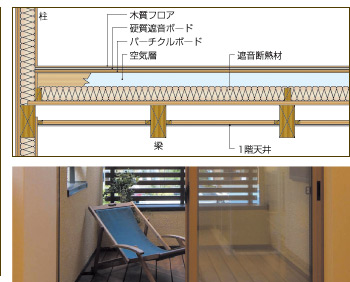 中間階の厚床張り合板の上に、吸音材としてのグラスウールと空気層を設けて遮音性を高めた床。空気層部分は配管・配線スペースとしても活用できる。また、バルコニー出入りのためのまたぎを無くし、フラットな出入りを可能とする。