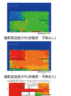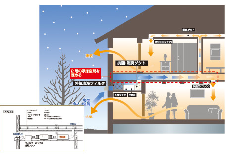 中間階2重床【快床】の空気層をチャンバーとして、外気を導入、温水予熱装置を通して予熱した新鮮空気を各室に搬送し、全館を15℃以上に保つ。また、中間階床は床暖房効果を生み、1階床暖房と併用することで、全館温度差の無い、朝方でも15℃を下回らない快適な環境が実現できる。